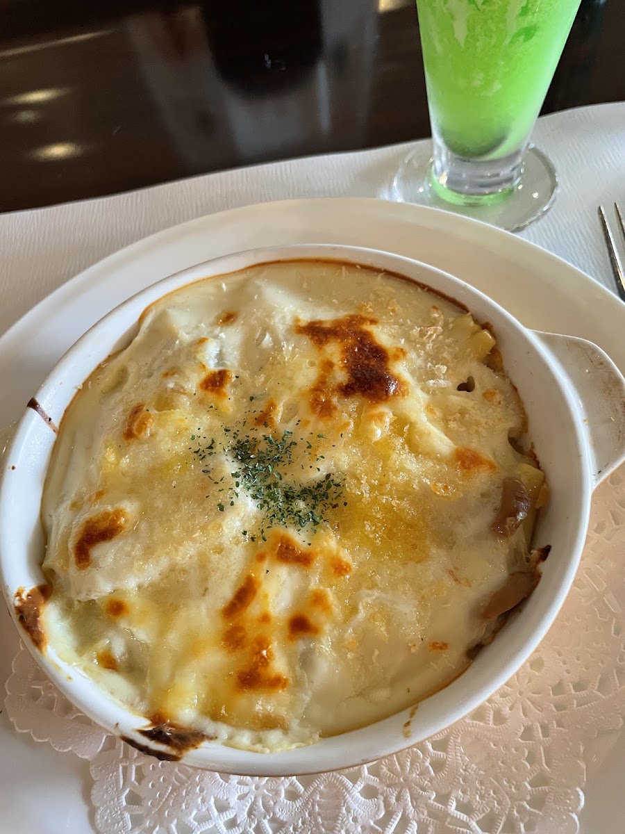 Forestier Seiyoken also excels in lighter fare, ideal for brunch or a cozy afternoon meal. The フォレス ティー ユ セット キャベツ の ポタージュ is a soothing cabbage potage served with a thoughtful tea set, making it a lovely choice for those seeking a relaxing start to the day. Meanwhile, the シーフードマカロニ チーズグラタンとパン is a decadent option, combining creamy macaroni and seafood in a golden cheese crust, accompanied by freshly baked bread that rounds out the experience beautifully.